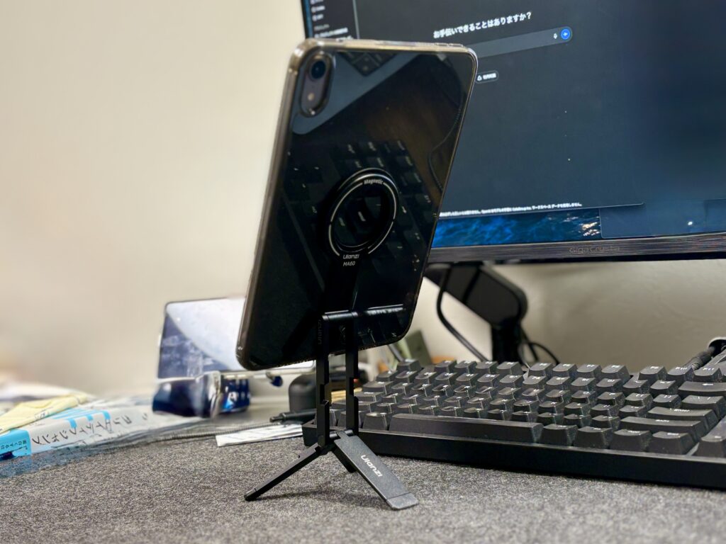 今回いちばんこだわったのは三脚です。MagSafe対応で必要に応じて取り外せて、かつiPhoneとも使い回せる。この条件で探していたら「Ulanzi」というメーカーのものが良さそうだったので購入しました。